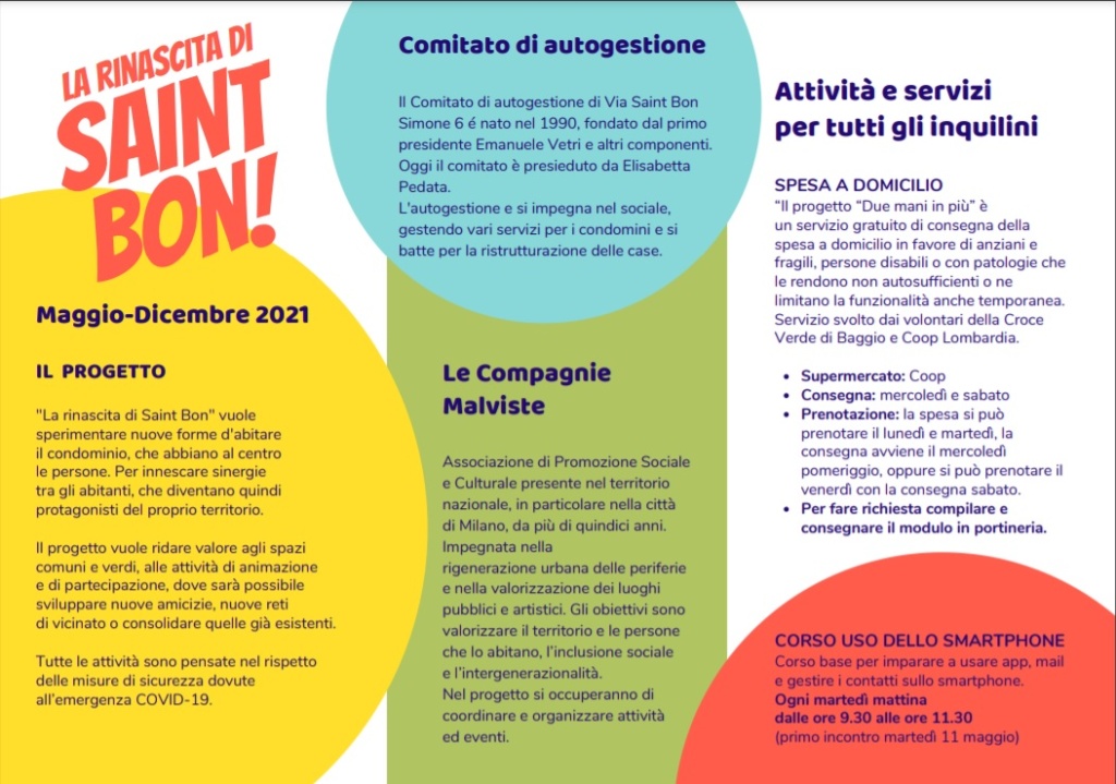 Il progetto si è svolto da aprile a dicembre 2021. Sono state varie le attività messe in campo, che hanno avuto come obiettivo principiale il coinvolgimento degli abitanti del complesso residenziale di Via Saint Bon 6, per rafforzare l’inclusione sociale e migliorare la qualità della vita, per sperimentare nuove forme di abitare il condominio che abbiamo al centro le persone.